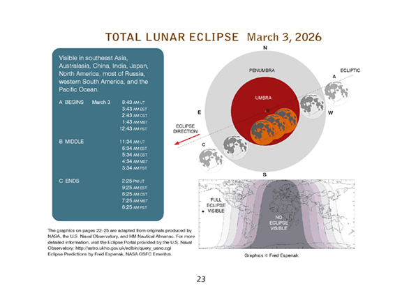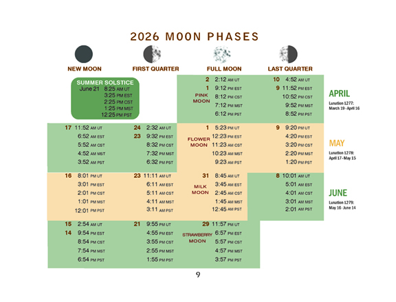 What's inside? Times for all North American time zones for full moon, new moon, first quarter moon, and last quarter moon phases. Definitions and graphic examples of the moon in its vartious phases, average durations of phases, and how lunations compare over time. Moon perigees and apogees, including closest and farthest distances for 2026. For 15 major U.S. cities, local rising and setting times for first quarter moons, full moons, and last quarter moons. Where on the horizon the full moons rise and set for 2026, for 15 major U.S. cities. Maximum height in the sky for each full moon. Guidelines for observing the earliest first crescent moons. Sky sights near the moon for 2026 -- major planets and stars visible in urban areas without telescopes. Lunar and solar eclipses for the year -- two each in 2026, but not all will be visible from North America. Traditional Native American and colonial names for each full moon in 2026. Religious holidays around the world associated with the moon. A unique chart of the days of the year and the hours of moonlight for each, graphically displayed. Major high and low tide dates for 2026, with an explanation of factors associated with tidal forces. Plus ... a list of online moon resources and a glossary of key terms. |