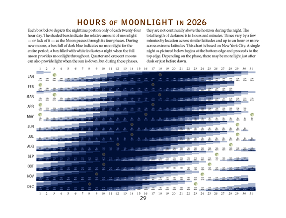 What's inside? Times for all North American time zones for full moon, new moon, first quarter moon, and last quarter moon phases. Definitions and graphic examples of the moon in its vartious phases, average durations of phases, and how lunations compare over time. Moon perigees and apogees, including closest and farthest distances for 2026. For 15 major U.S. cities, local rising and setting times for first quarter moons, full moons, and last quarter moons. Where on the horizon the full moons rise and set for 2026, for 15 major U.S. cities. Maximum height in the sky for each full moon. Guidelines for observing the earliest first crescent moons. Sky sights near the moon for 2026 -- major planets and stars visible in urban areas without telescopes. Lunar and solar eclipses for the year -- two each in 2026, but not all will be visible from North America. Traditional Native American and colonial names for each full moon in 2026. Religious holidays around the world associated with the moon. A unique chart of the days of the year and the hours of moonlight for each, graphically displayed. Major high and low tide dates for 2026, with an explanation of factors associated with tidal forces. Plus ... a list of online moon resources and a glossary of key terms. |